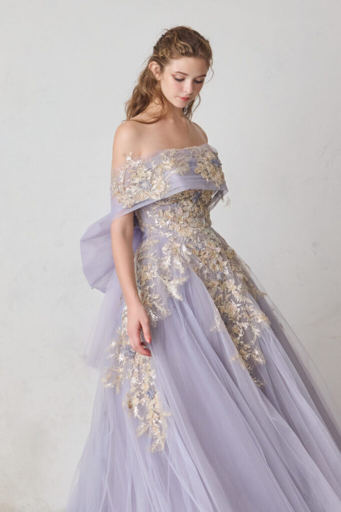 金糸の刺繍レースとビーディングの輝きが全体を引き締め、ナチュラルとエレガントが調和した