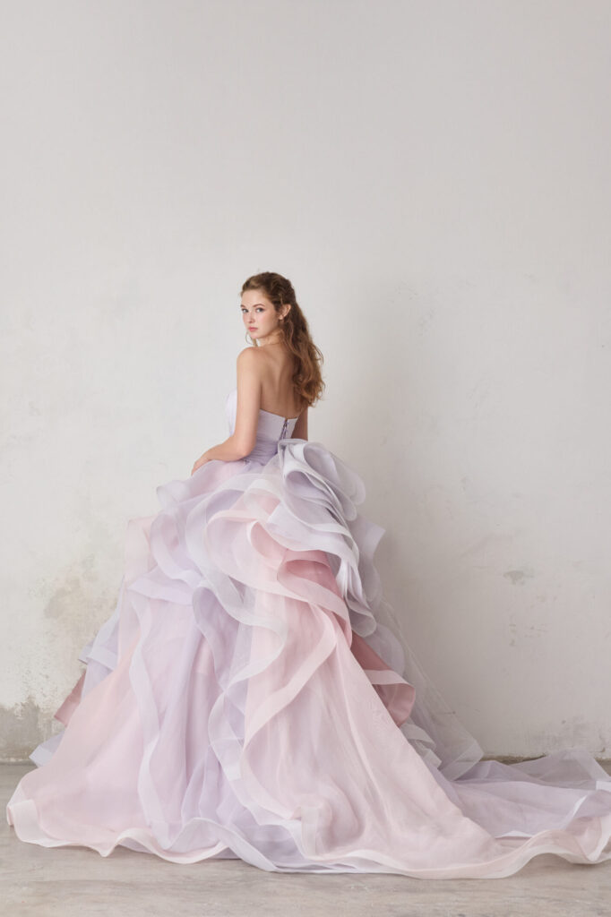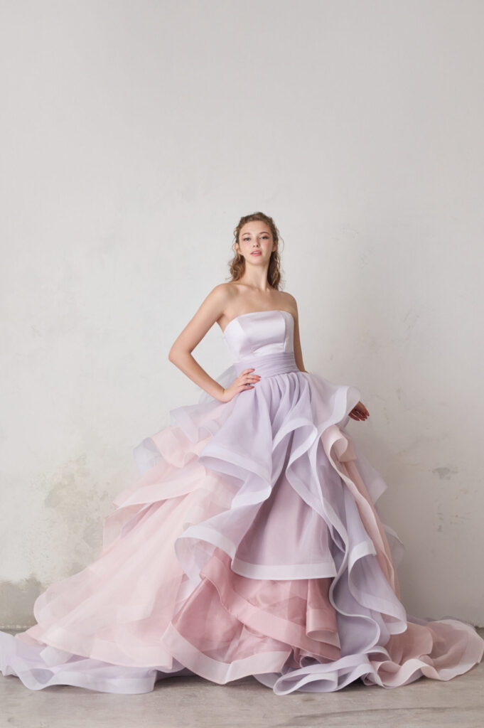透明感のあるラベンダーに、ほんのりピンクを重ねた軽やかなドレスです。