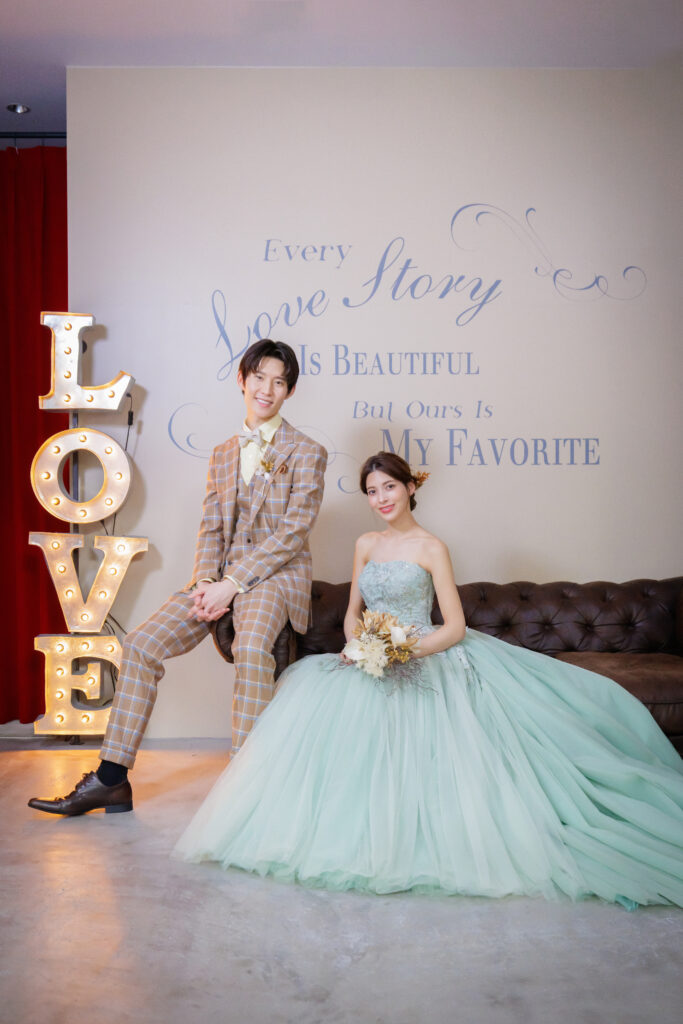 柔らかなミントグリーンのドレスが、スタジオの空気を明るく華やかに彩るカット。