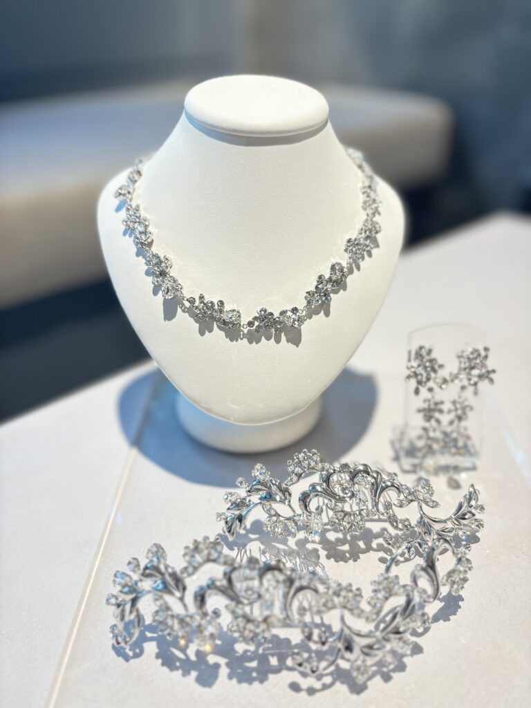 何工程も経て、細部の鏡面に輝くまで丁寧に磨き仕上げられているため、本当に輝きが美しいウェディングアクセサリーです。