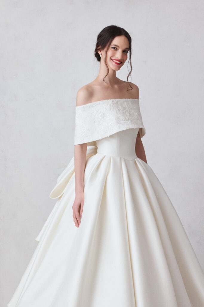 「テクスチャーミックス」異なる素材を組み合わせて、立体感や表情を出すデザイン。シンプル素材+レース=エレガント・上品シンプルな素材がレース素材の繊細さと透け感を引き立たせ、高級感が出る印象となります。